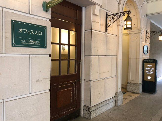 手前のオフィス入口の扉からエレベータでお越しください。